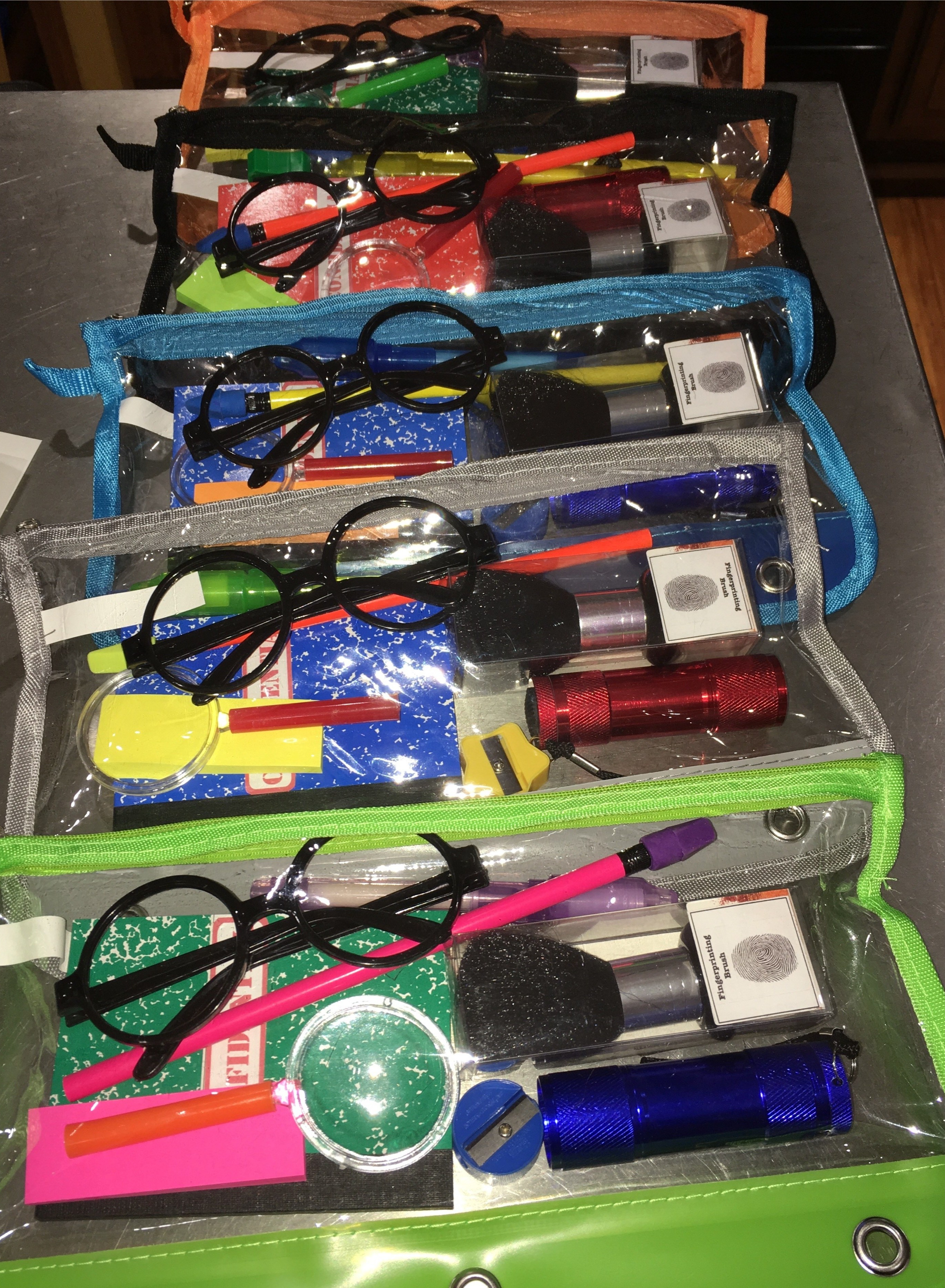 Although I can’t find much in the way of decorations, I found a TON of ideas for props, activities, and disguises. I’ve already had a ton of fun putting together a detective kit for each of my students. I bought a soft pencil case for the kits. In each kit is: